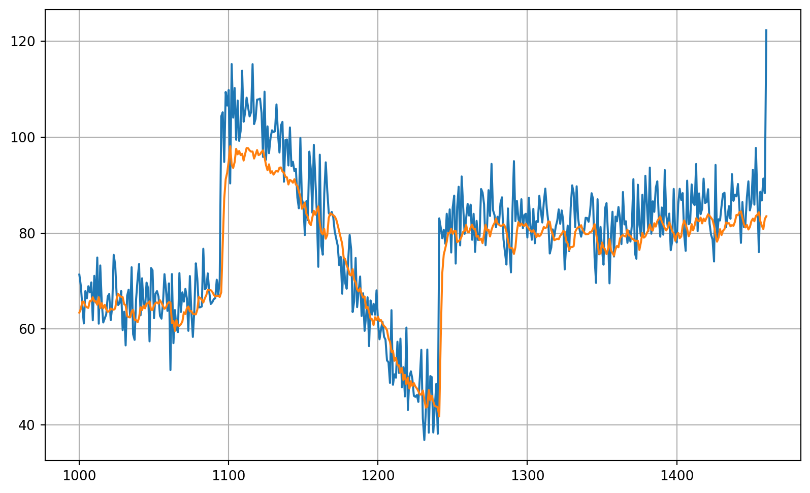 plot_series(time_valid, (x_valid, results)) 1/Unknown 0s 167ms/step 29/Unknown 0s 6ms/step 29/29 ━━━━━━━━━━━━━━━━━━━━ 0s 7ms/step