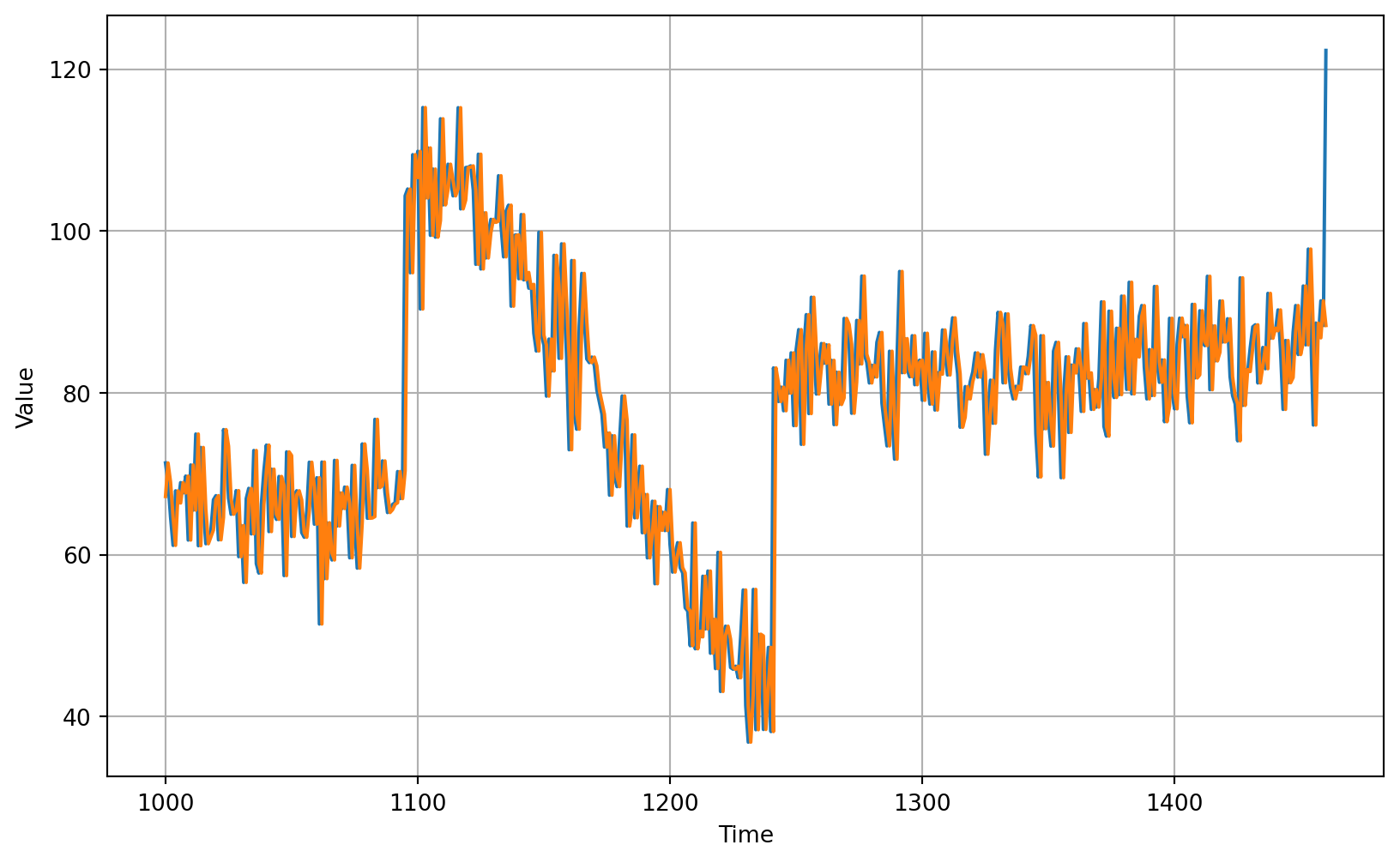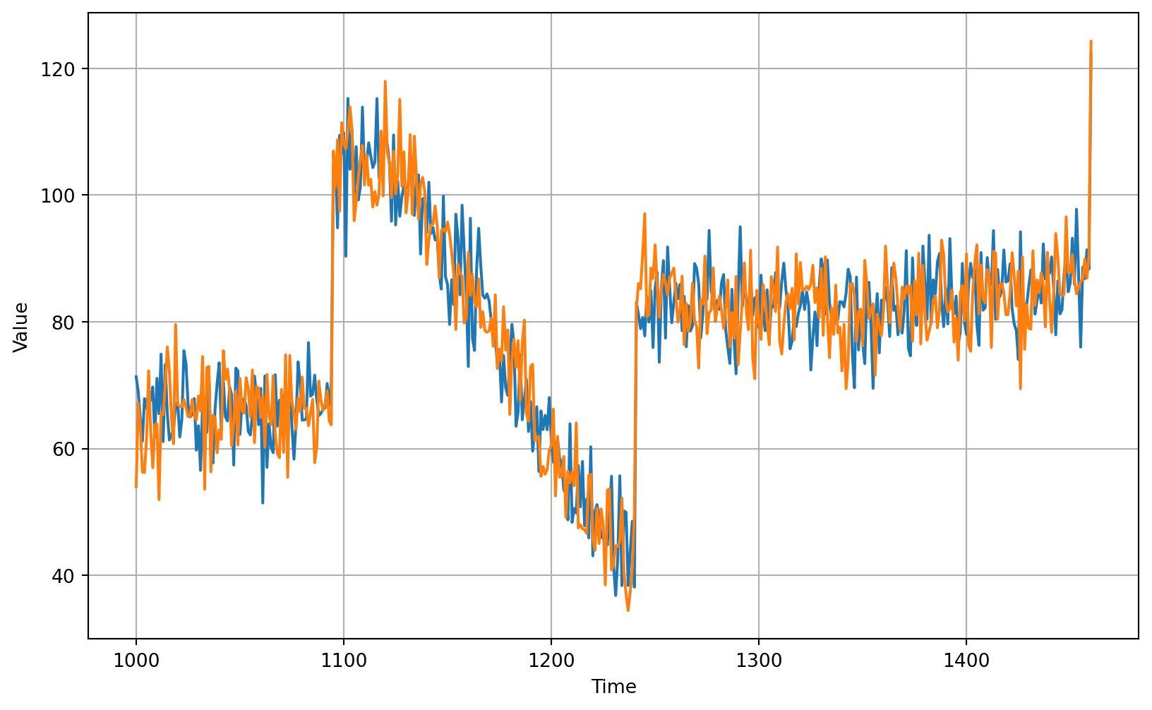 plot_series(time_valid, (x_valid, naive_forecast))