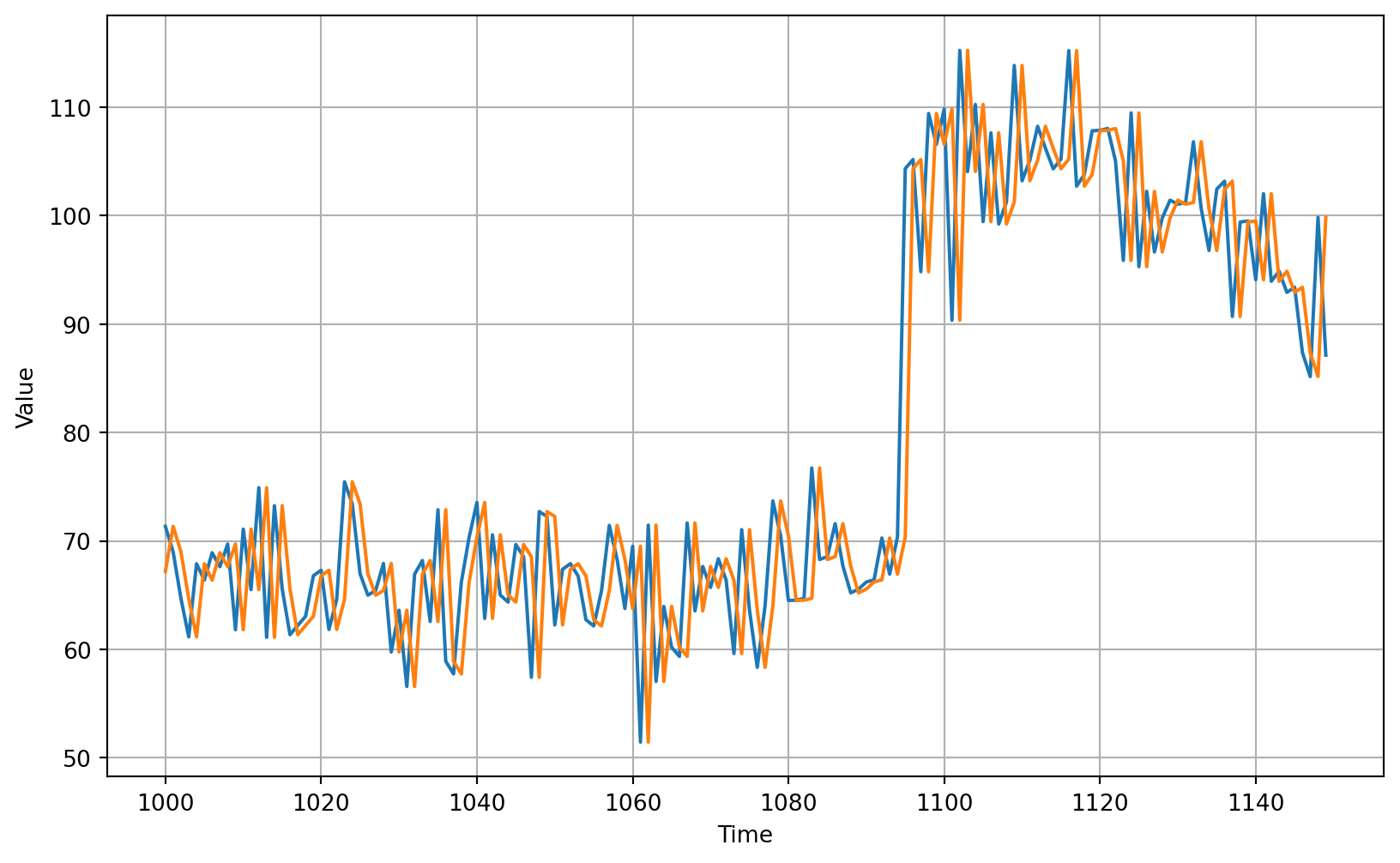 plot_series(time_valid, (x_valid, naive_forecast), start=0, end=150)