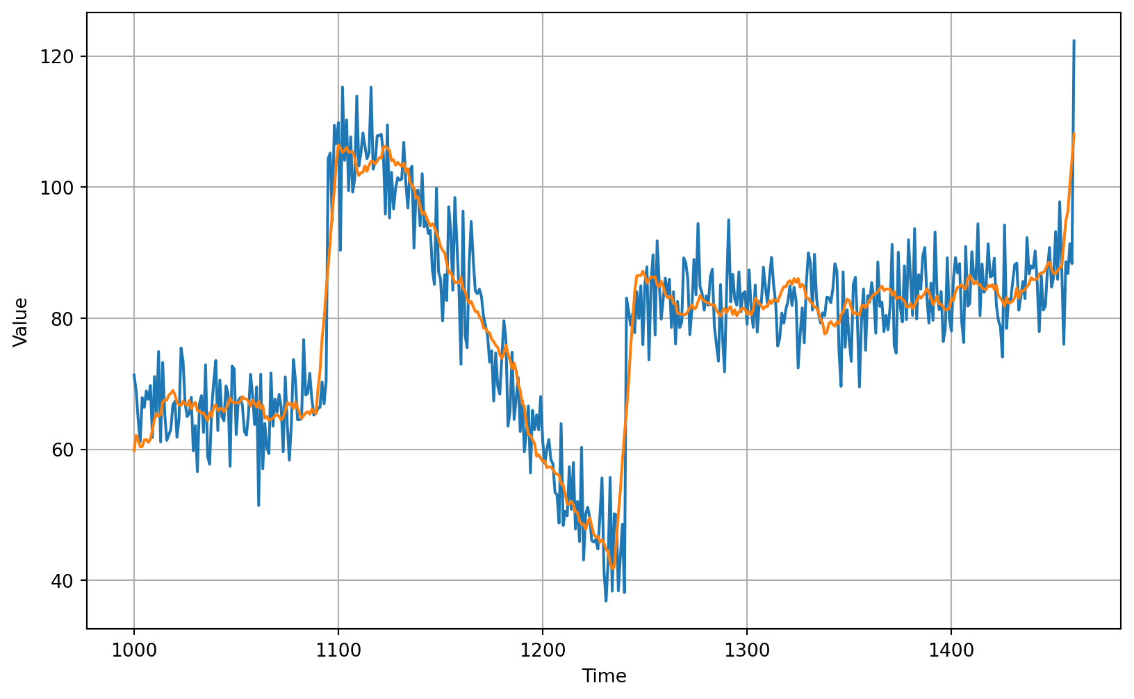 plot_series(time_valid, (x_valid, moving_avg))